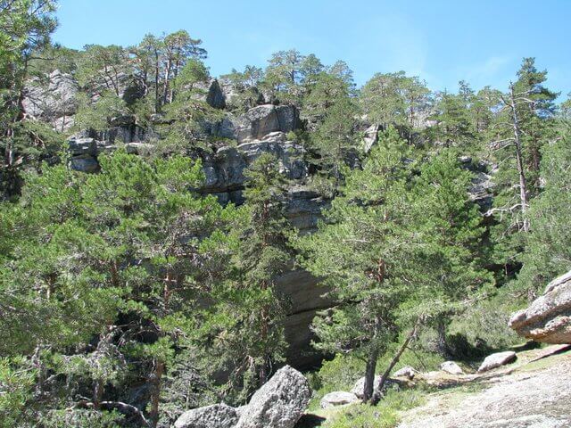 La Ruta de las Cascadas comienza a la altura de Majafalsa a donde se puede llegar en coche por el camino forestal que lleva a Castroviejo. Allí veréis un cartel que anuncia la ruta y un poco más adelante (20m), a mano izquierda, veremos el comienzo de la ruta indicado con marca blanca y azul. Desde ese lugar tenemos una vista panorámica del tramo de pinar que atravesaremos hasta llegar al roquedo conocido como Castroviejo y que se puede apreciar en la vista.